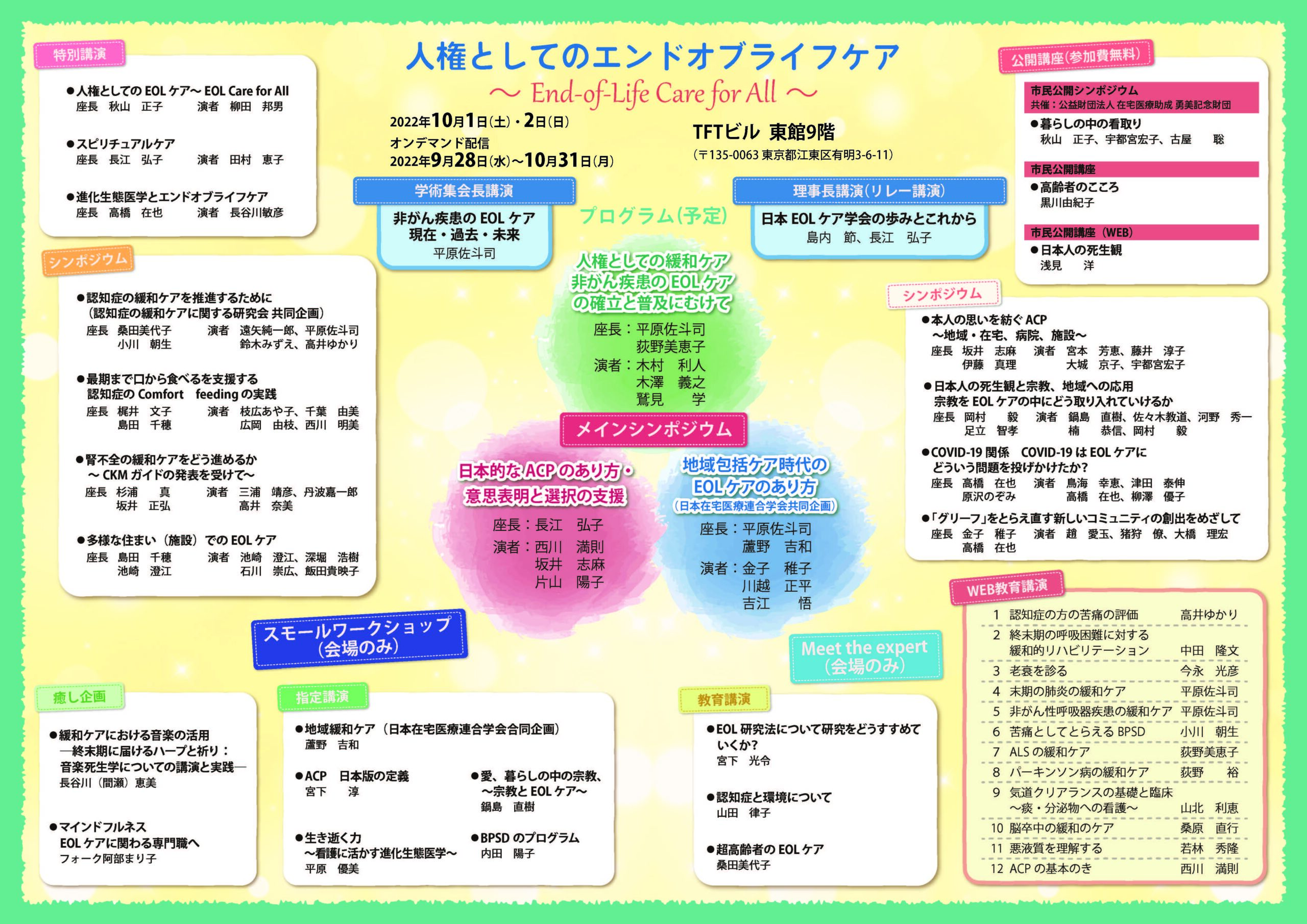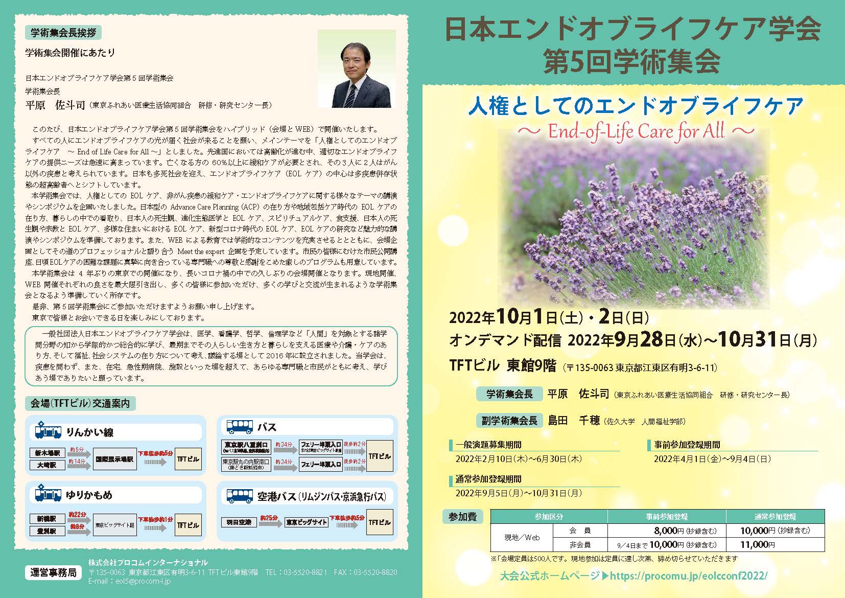 第5回学術集会 2022年10月1日 最終更新日時 : 2022年10月1日 staff02@adculture 人権としてのエンドオブライフケア~End-of-Life Care for All~ 日時 2022年10月1日(土)・2日(日) WEBとのハイブリット開催 (オンデマンド配信 2022年9月28日(水)~11月11日(金)) 会場 TFTビル東館 東京都江東区有明3-6-11 学術集会専用ホームページはこちら 第5回学術集会を終えて〜学術集会長からのメッセージ〜 頒布チラシはこちら 【学術集会の概要】 【学術集会のプログラムの魅力】