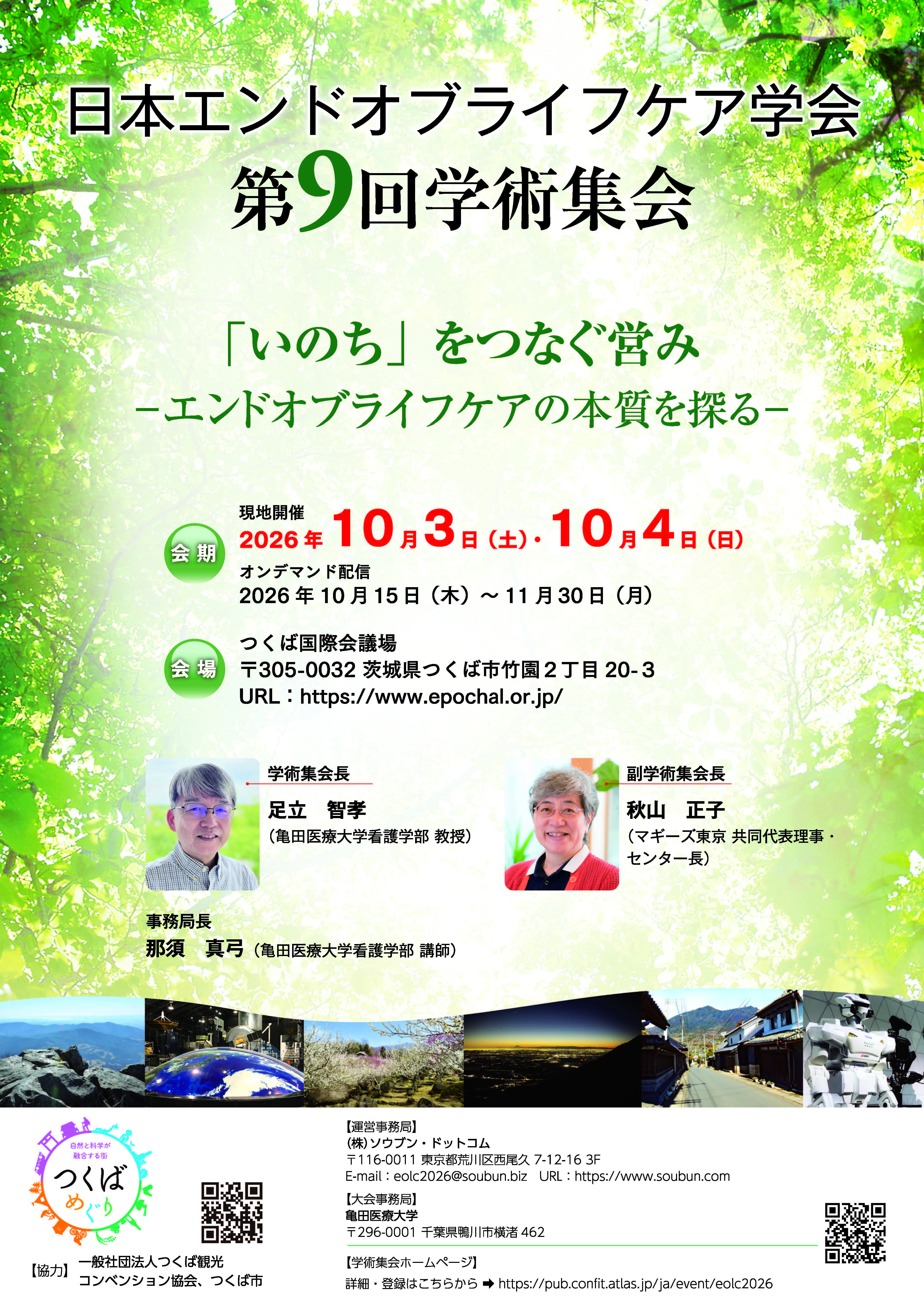 第9回学術集会 2025年11月7日 最終更新日時 : 2025年11月7日 eolc-pw 「いのち」をつなぐ営み-エンドオブライフケアの本質を探る- 日時 2026年10月3日(土)~10月4日(日) 会場 つくば国際会議場 〒305-0032 茨城県つくば市竹園2丁目20-3 学術集会専用ホームページはこちら 頒布チラシはこちら