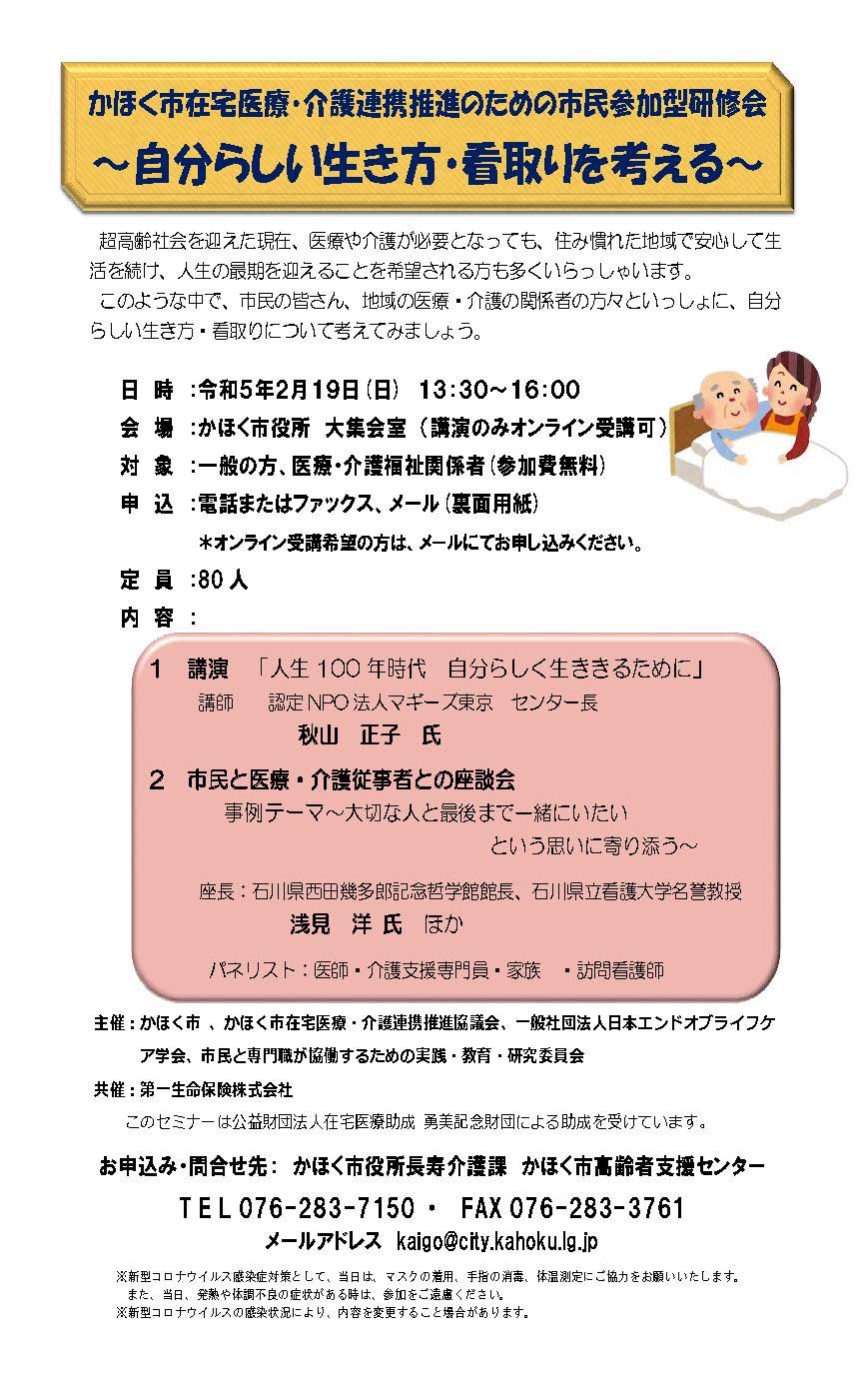 - かほく市 、かほく市在宅医療・介護連携推進協議会、一般社団法人日本エンドオブライフケア学会、市民と専門職が協働するための実践・教育・研究委員会