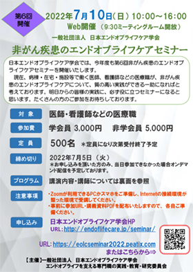 日本エンドオブライフケア学会 EOLケアを支える専門職の実践・教育・研究委員会では、第6回非がん疾患のエンドオブライフケアセミナーを2022年7月10日(日)にWEB開催いたします。