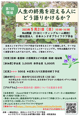 日本エンドオブライフケア学会EOLケアを支える専門職の実践・教育・研究委員会では、第7回エンドオブライフケアセミナーを2023年5月21日(日)にWEB開催します。